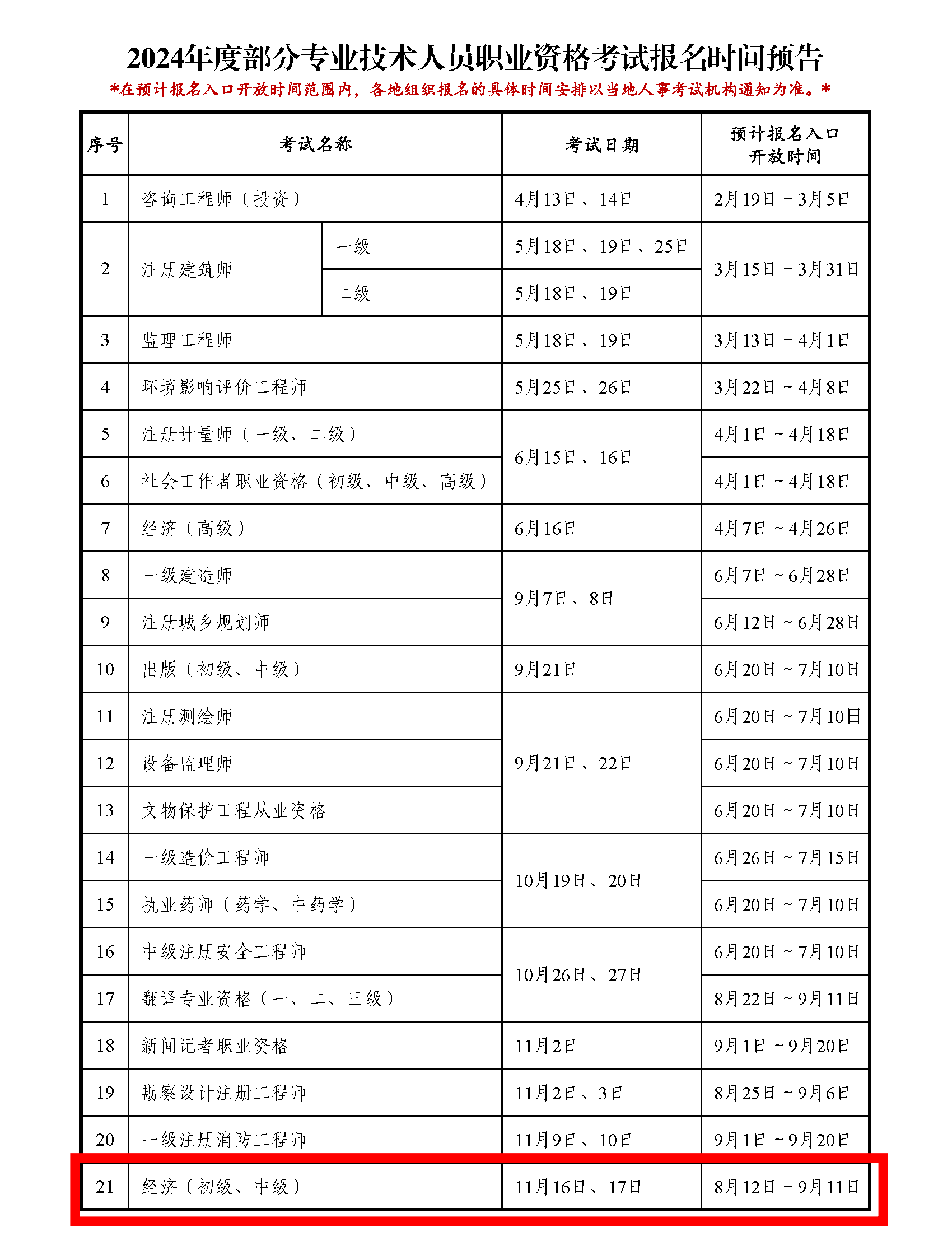 中国人事考试网发布<2024年度专业技术人员职业资格考试重要提示>,其中预告了2024年初中级经济师报名时间,推迟近一月!
