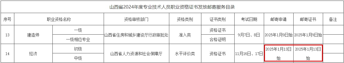 【邮寄目录】山西省2024年度专业技术人员职业资格证书发放邮寄服务目录