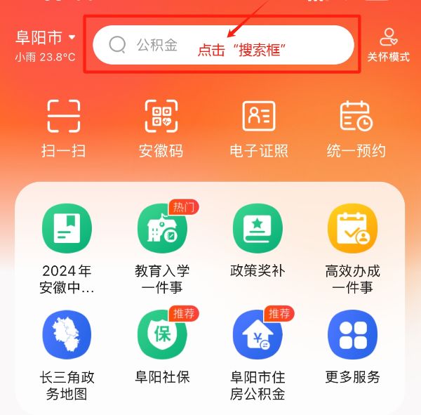1.打开皖事通APP并完成账户登录,点击首页“搜索框”。