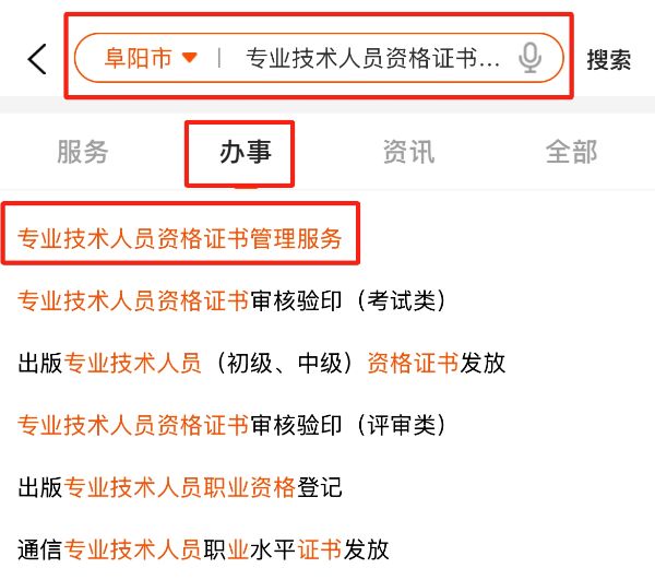 2.在跳转的页面内输入“专业技术人员资格证书管理服务”,选择“办事”模块,点击下方“专业技术人员资格证书管理服务”,选择办事地区“阜阳市”,点击“去办理”。