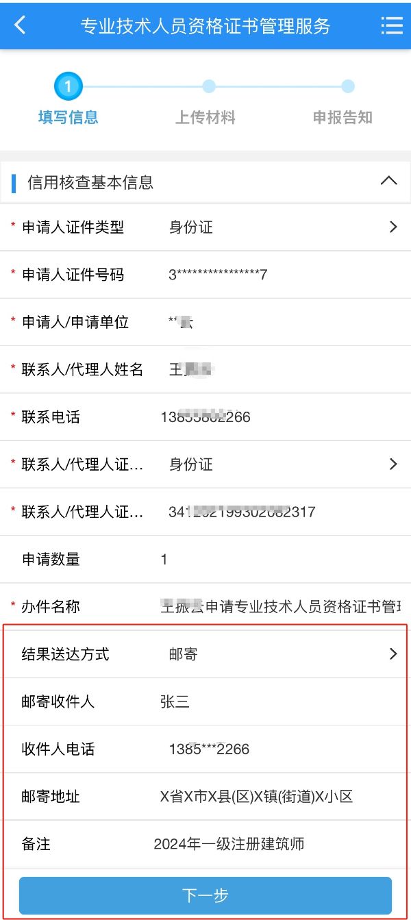3.在“结果送达方式”中选择“邮寄”,完善邮寄收件人姓名、电话、地址等信息,在“备注”栏填写拟申领证书的考试年度和名称,如“2024年一级建筑师”,点击“下一步”,最后在跳转的页面中点击“提交申请”即可完成。