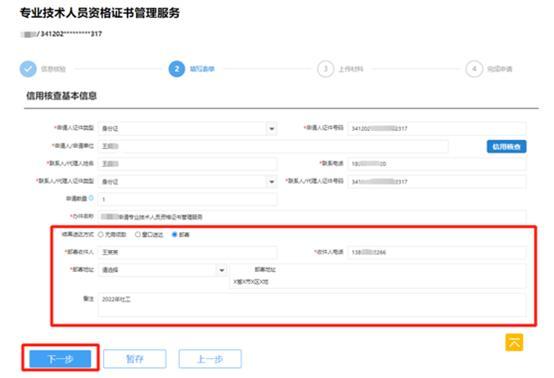 3.在“结果送达方式”中选择“邮寄”,完善邮寄收件人姓名、电话、地址等信息,在“备注”栏填写拟申领证书的考试年度和名称,如“2022年社工”点击“下一步”,最后在跳转的页面中点击“提交”即可完成。