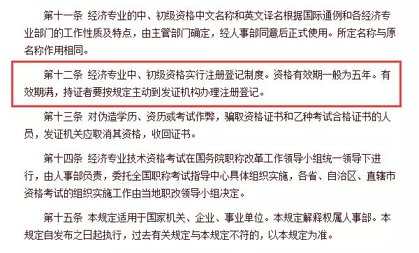 根据人社部2013年发布的《经济专业技术资格考试暂行规定》,经济专业中、初级资格实行注册登记制度。取得经济专业技术资格证书的申请人,应自证书签发之日起1年内提出初始注册申请。证书有效期一般为5年,有效期满,持证者要按规定主动到发证机构办理注册登记。