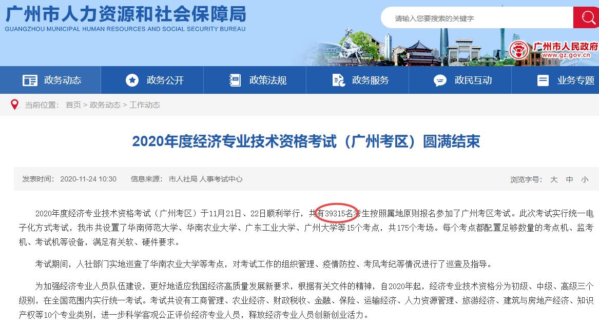 2020年11月24日,广州市人力资源和社会保障局发布“2020年度经济专业技术资格考试(广州考区)圆满结束”,文中提到,共有39315名考生按照属地原则报名参加了广州考区2020年初中级经济师考试。截图如下: