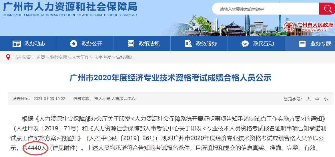 2021年1月6日,广州市人力资源和社会保障局发布“广州市2020年度经济专业技术资格考试成绩合格人员公示”通知,通知提到,考试成绩合格人员共4440人。截图如下: