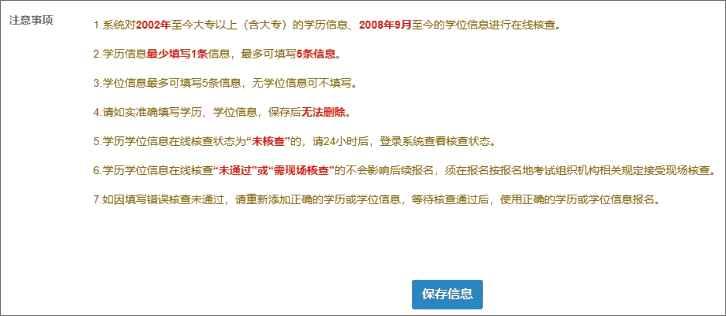4.请如实准确填写学历、学位信息,保存后无法删除。