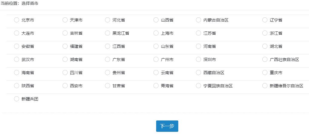 四、选择要报考的省份,然后点击【下一步】,注意:大连、武汉、西安、广州、深圳为单独的报名入口。