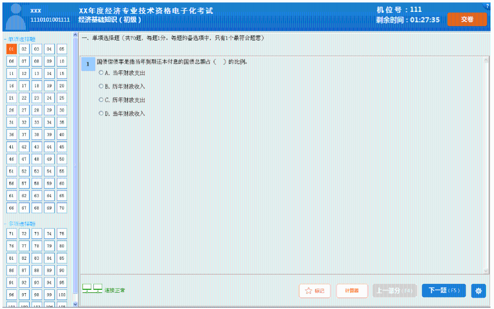 标题栏从左到右,依次显示应试人员基本信息、本场考试名称、考试科目名称、机位号、考试剩余时间、“交卷”按钮。