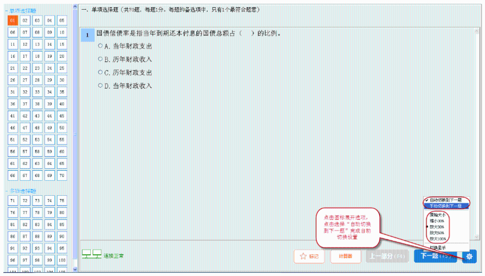 3.选择“自动切换到下一题”模式时,在答题完成后自动跳转到下一题。(自动切换设置只对单项选择题有效,对多项选择题、案例分析题无效)