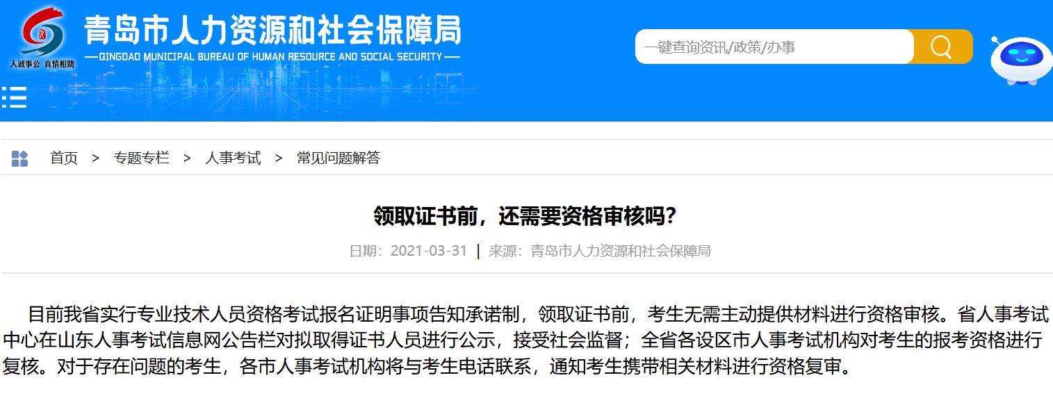 青岛市人力资源和社会保障局回复:目前我省实行专业技术人员资格考试报名证明事项告知承诺制,领取证书前,考生无需主动提供材料进行资格审核。省人事考试中心在山东人事考试信息网公告栏对拟取得证书人员进行公示,接受社会监督;全省各设区市人事考试机构对考生的报考资格进行复核。对于存在问题的考生,各市人事考试机构将与考生电话联系,通知考生携带相关材料进行资格复审。