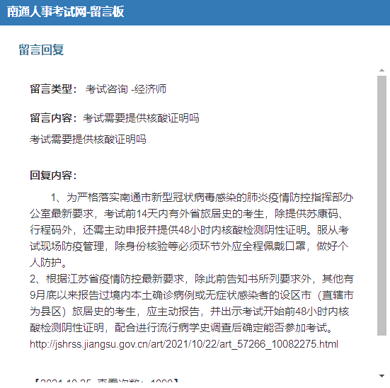 考生咨询:南通2021初中级经济师考试需要提供核酸证明吗?