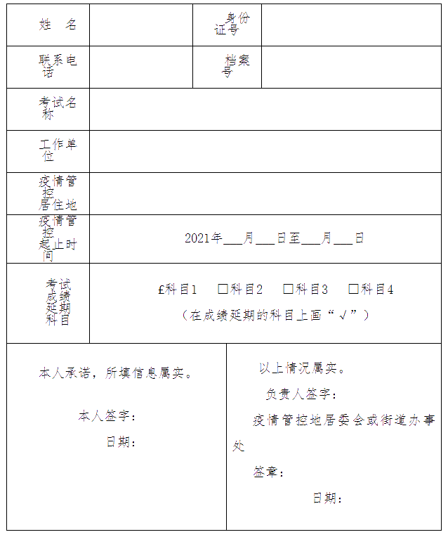相关考生须提供有效身份证件复印件、准考证、成绩单和疫情管控有关证明材料并按要求填写《因疫情管控考试成绩延期申请表》(见附件)。