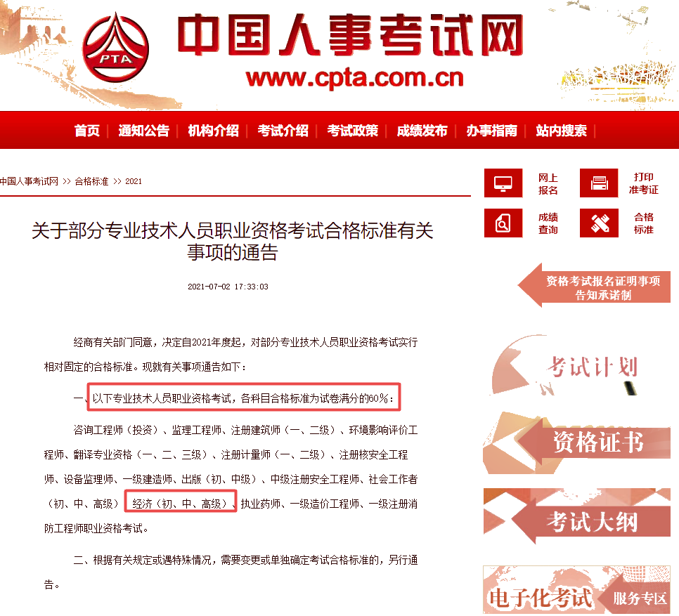 根据中国人事考试网发布的“关于部分专业技术人员职业资格考试合格标准有关事项的通告”可知,人社部决定自2021年度起,对部分专业技术人员职业资格考试实行相对固定的合格标准。其中,经济师(初、中级)考试各科合格标准为试卷满分的60%。