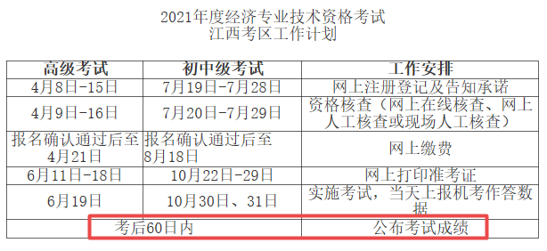 根据《2021年度经济专业技术资格考试江西考区工作计划》可知,2021年江西中级经济师考试成绩查询时间为考后60日内。
