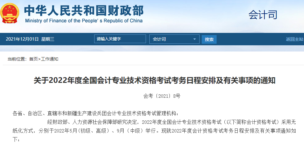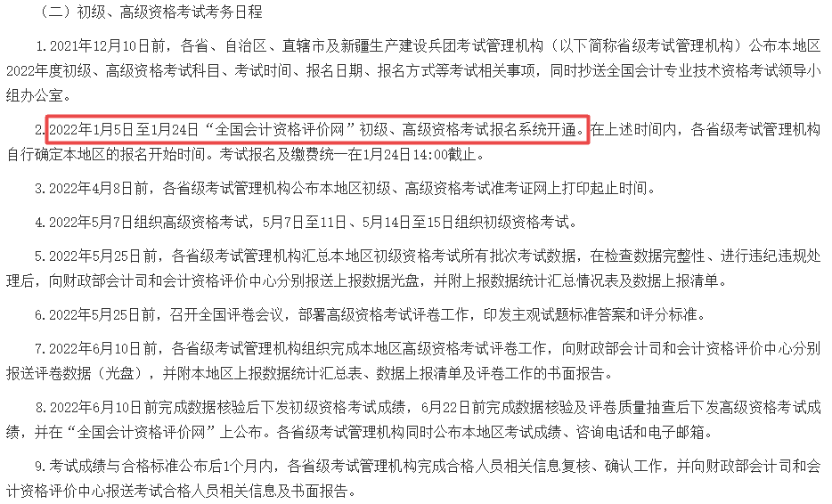 中华人民共和国财政部发布《关于2022年度全国会计专业技术资格考试考务日程安排及有关事项的通知》,2022年初级、高级会计职称考试报名时间为2022年1月5日至1月24日。中级会计职称考试报名时间为2022年3月10日至3月31日。