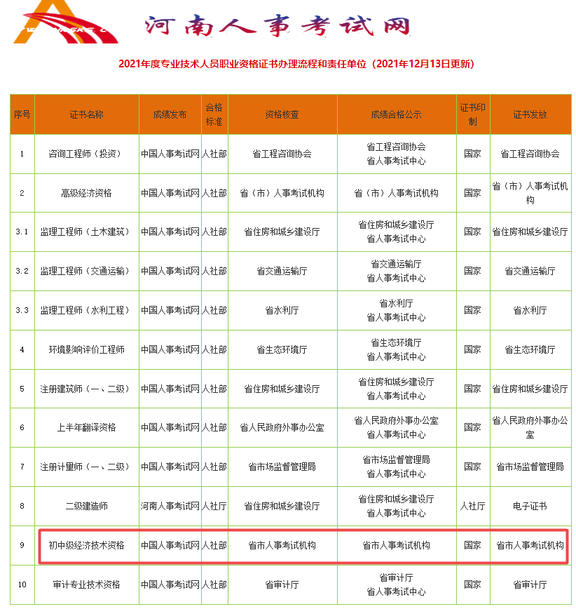 河南人事考试网发布“2021年度专业技术人员职业资格证书办理流程和责任单位(2021年12月13日更新)”,2021年河南初中级经济师证书发放由省市人事考试机构进行。