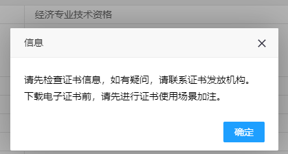 初中级经济师持证人员首次登录证书下载系统时,点击下载证书时候会提示如下图所示内容: