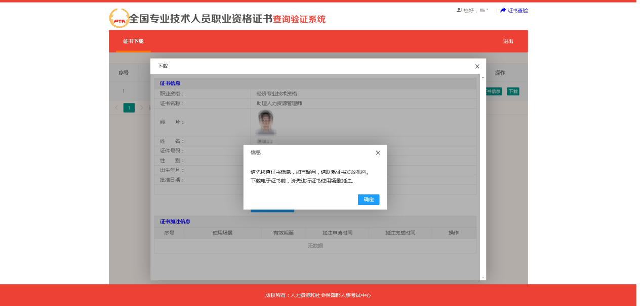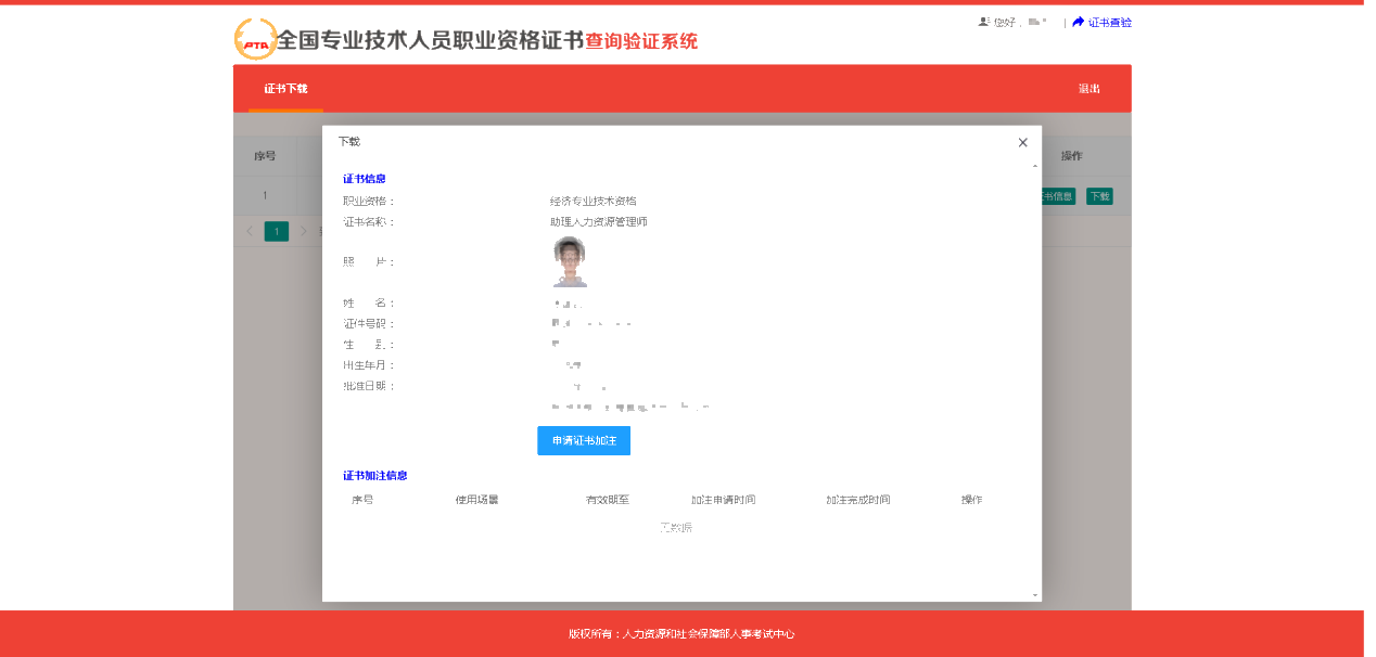 点击[下载]按钮,进入电子证书加注、下载页面。证书加注信息内容为空,或者提示“加注件已过期”,须首先完成加注申请。