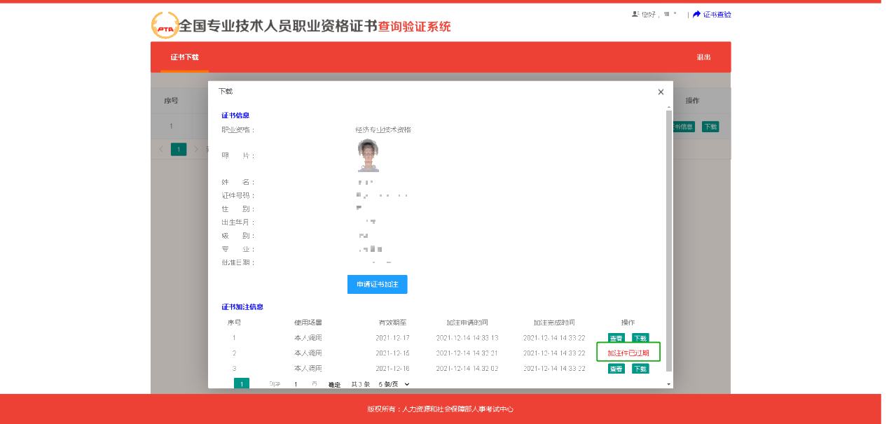 2.证书加注信息栏显示[加注件已过期],无法查看和下载电子证书。