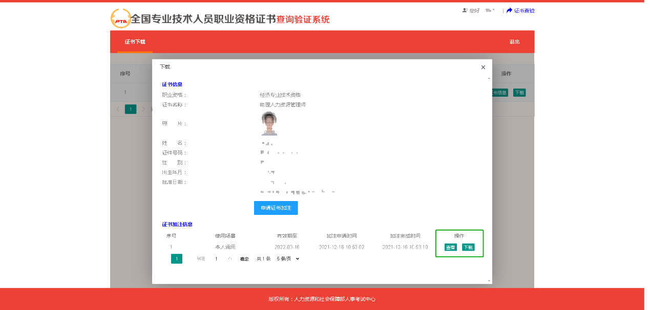 已完成加注,且加注处于有效期内的电子证书,可点击[查看]或[下载]按钮,进行电子证书查看、下载操作。