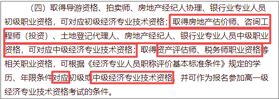 房地产估价师、咨询工程师(投资)、土地登记代理人、房地产经纪人、银行业专业人员中级职业资格、满足中级经济师报名条件的资产评估师和税务师证书。