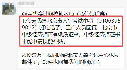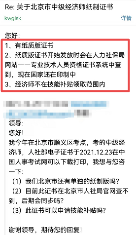 根据网校学员反馈,咨询北京人事考试网得到回复为:北京市中级经济师还有纸质证书。以下是截图: