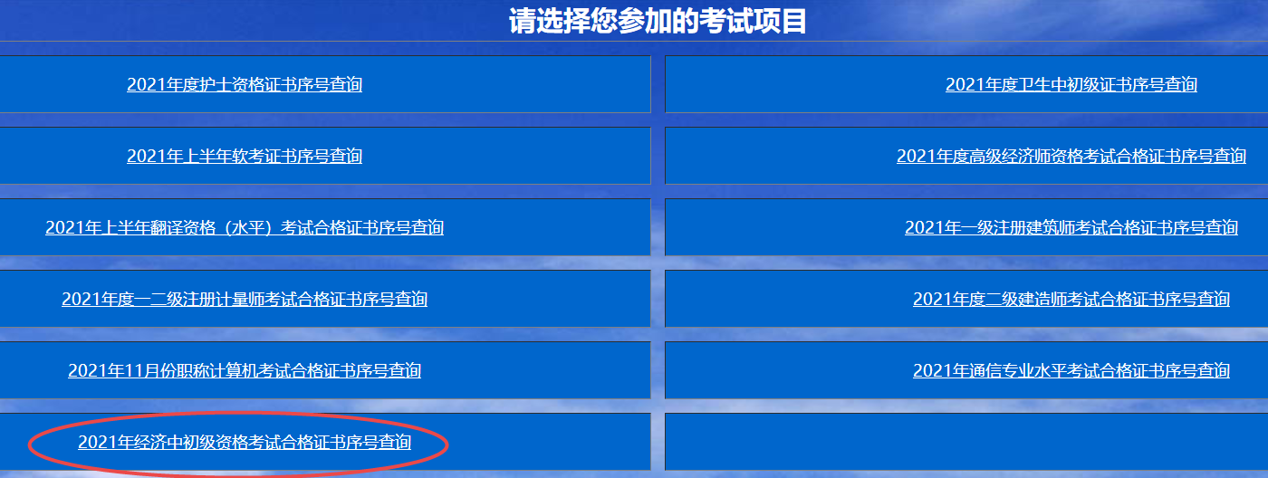 步骤3:选择“2021年经济中初级资格考试合格证书序号查询”进行查询。