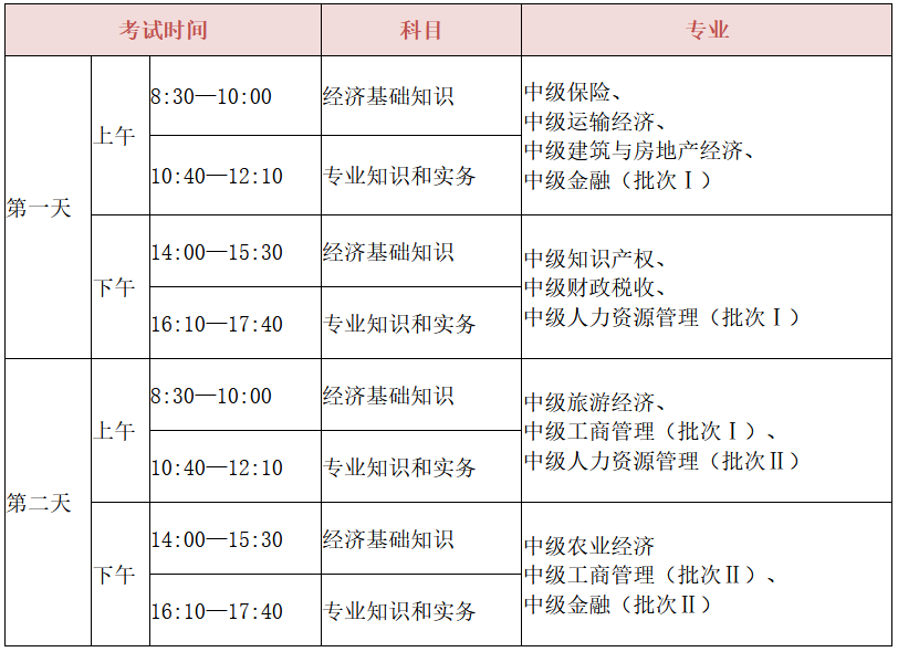 2022年中级经济师考试时间已确定为11月12-13日两天,分四个批次进行,考试安排如下: