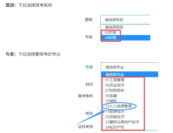 想要报名人力资源管理师,在中级经济师报名时,报名信息填写,报考级别选择中级,报考专业需要选择人力资源管理专业!如下图所示: