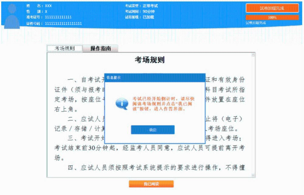 若考试开始时间已到,应试人员还没有点击“我已阅读”,则系统发出提示信息。