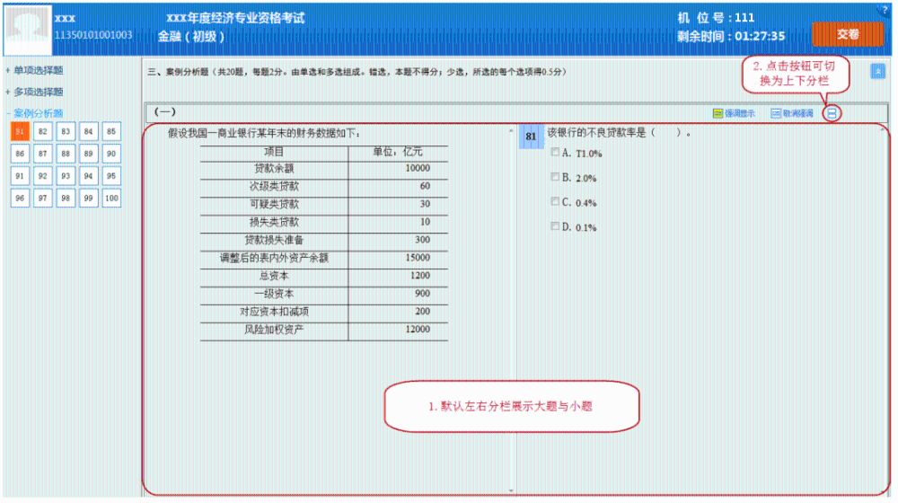 案例分析题默认左右分栏展示案例背景与试题。点击切换按钮可以切换分栏模式。