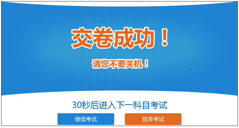 4.同时报考《经济基础知识》科目和《专业知识与实务》科目的应试人员第一科目交卷成功后,经过30秒倒计时后,系统会自动进入下一科目作答界面。应试人员也可以点击“继续考试”按钮,立即进入下一科目作答。如果应试人员不想继续作答下一科目,可以点击“放弃考试”按钮,结束当次的考试。30秒倒计时的时间不计算在作答时间内。
