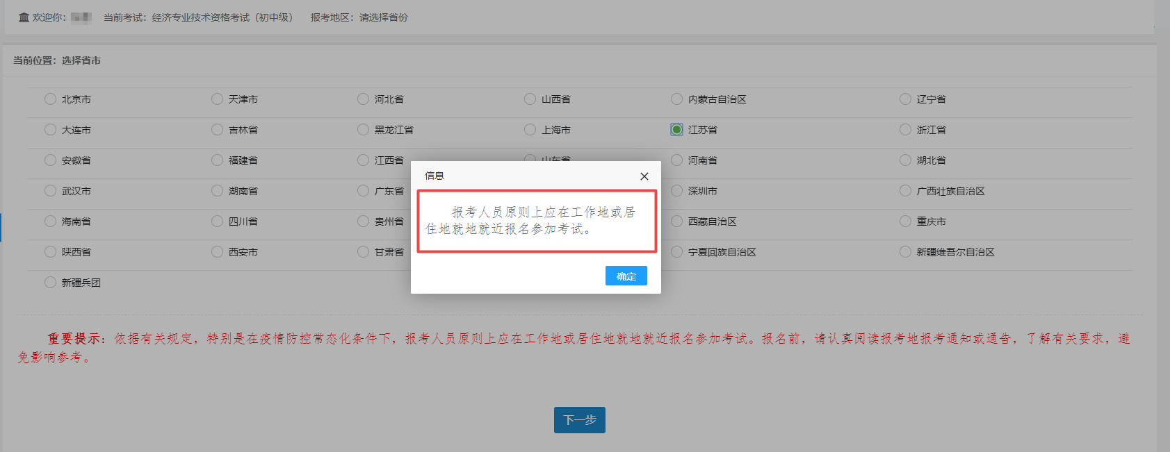3、选择报考地区,注意报考人员原则上应在工作地或居住地就地就近报名参加考试。报名前,请认真阅读报考地报考通知或通告,了解有关要求,避免影响参考。