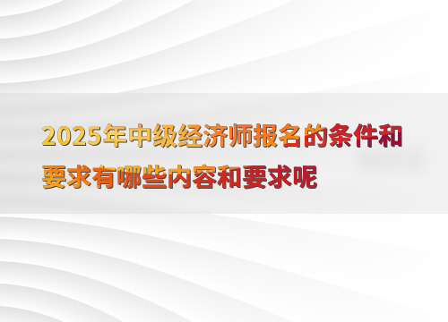 2. 报名中级经济师需要哪些条件?答:需要具备相应的学历和工作经验,具体条件包括高中学历加初级资格满10年,大学专科学历满6年,大学本科学历或学士学位满4年,第二学士学位或研究生班毕业满2年,硕士学位满1年,博士学位。