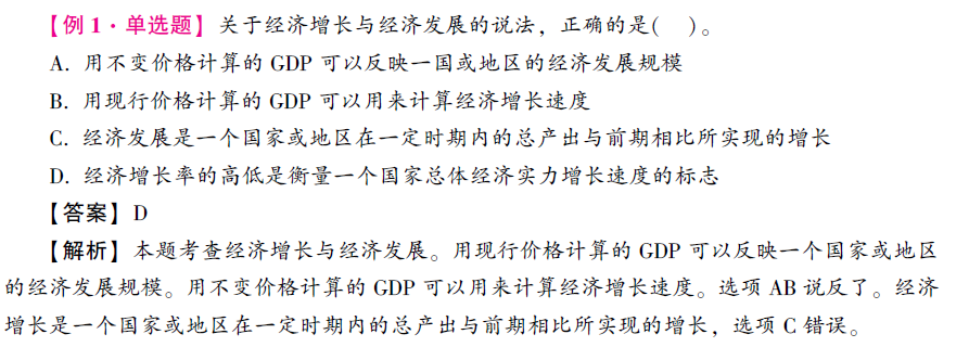 【解析】本题考查经济增长。由于GDP的计算中包含了产品或服务的价格因素,所以在计算GDP时,就可以分为:用现价计算的GDP和用不变价格计算的GDP。用现行价格计算的GDP,可以反映一个国家或地区的经济发展规模,用不变价格计算的GDP可以用来计算经济增长速度。参见教材P54。