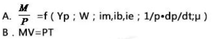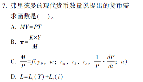 【解析】本题考查弗里德曼的现代货币数量说。弗里德曼提出的货币需求函数:M/P=f。参见教材P145。