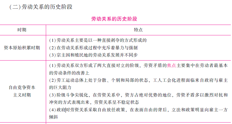 【解析】本题考查劳动关系的历史发展阶段形成背景及其特点。在自由竞争资本主义时期的劳动关系具有以下特点:(1)劳动关系双方形成了两大直接对立的阶级,劳资矛盾的焦点主要集中在劳动者最基本的劳动条件的改善上;(2)劳工运动总体上处于分散、个别和局部的状态,工人工会化进程面临来自政府与雇主的巨大阻力;(3)阶级斗争尖锐化,在劳资关系中,资方占绝对优势的地位,劳资矛盾多以激烈对抗和冲突的方式表现出来,劳资关系呈不稳定状态;(4)政府对劳资关系采取自由放任政策,在表面自由的背后,立法和政策明显向雇主一方倾斜。由此可知,本题选C。