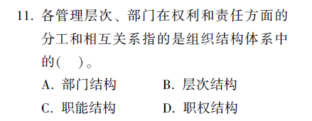 【解析】本题考查组织结构的内容。职权结构是各管理层次、部门在权利和责任方面的分工和相互关系。参见教材P22。
