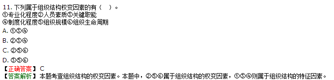 【解析】本题考查组织设计的权变因素。影响组织设计的主要权变因素有:组织环境、组织战略、组织技术、人员素质、组织规模、组织生命周期等。参见教材P24。