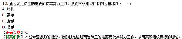 【解析】本题考查激励的定义。激励就是通过满足员工的需要而使其努力工作,从而实现组织目标的过程。参见教材P1。