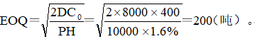 企业某种原材料的年需求量为8000吨,单价为10000元/吨,单次订货费用为400元,单位保管费率为1.6%,则该种原材料的经济订货批量为( )吨。