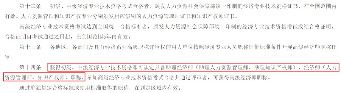 第十四条:获得初级、中级经济专业技术资格即可认定具备助理经济师(助理人力资源管理师、助理知识产权师)、经济师(人力资源管理师、知识产权师)职称。如下图所示: