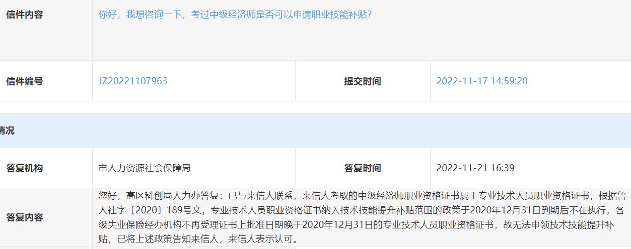 威海市人社局回复:已与来信人联系,来信人考取的中级经济师职业资格证书属于专业技术人员职业资格证书,根据鲁人社字〔2020〕189号文,专业技术人员职业资格证书纳入技术技能提升补贴范围的政策于2020年12月31日到期后不在执行,各级失业保险经办机构不再受理证书上批准日期晚于2020年12月31日的专业技术人员职业资格证书,故无法申领技术技能提升补贴,已将上述政策告知来信人,来信人表示认可。