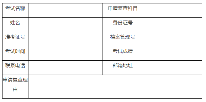 6、 复查考试成绩申请表一般样式如下(各省复查考试成绩申请表可能有所不同,具体请以当地人事考试中心公布的复查考试成绩申请表为准):