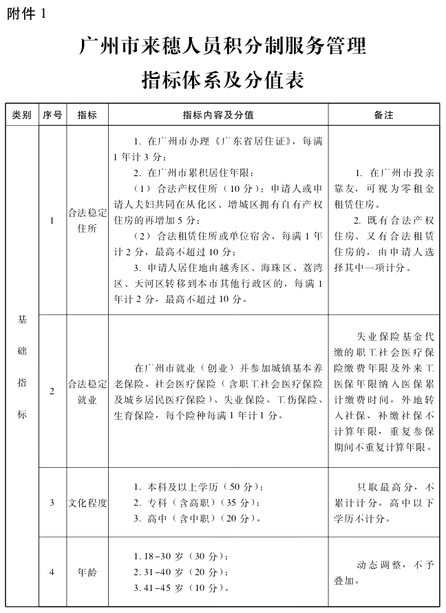 在本市合法稳定就业或创业、年龄在45周岁以下、持本市办理有效《广东省居住证》、缴纳社会保险满4年、按照《广州市来穗人员积分制服务管理指标体系及分值表》计算总积分满100分的人员,可申请积分制入户。