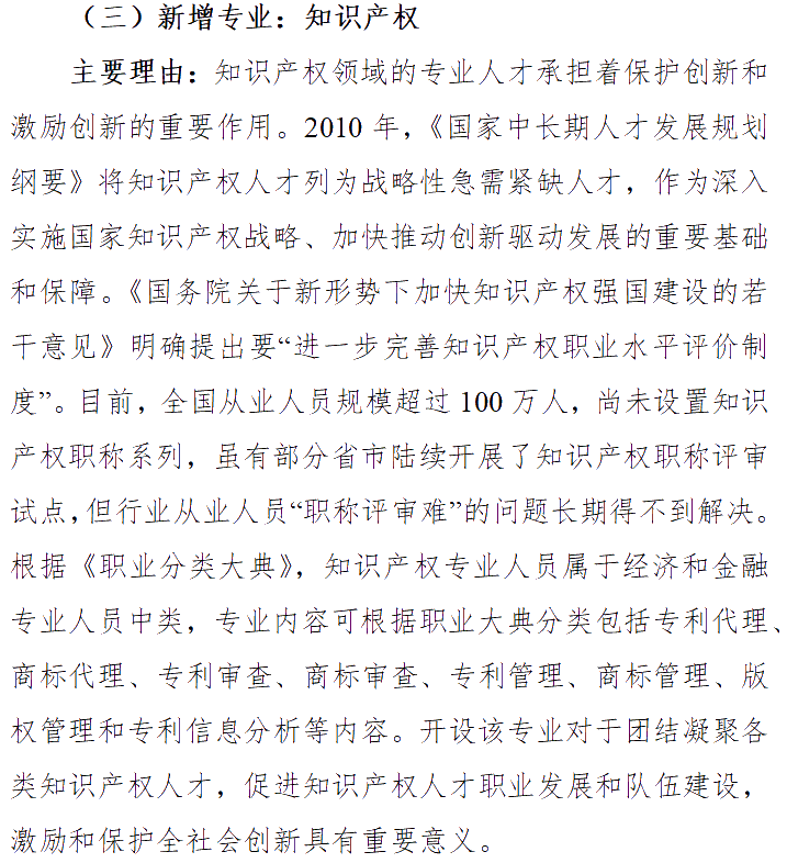 2、开设该专业对于团结凝聚各类知识产权人才,促进知识产权人才职业发展和队伍建设,激励和保护全社会创新具有重要意义。