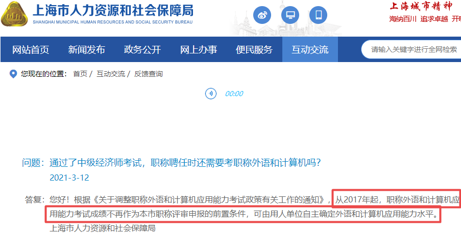 上海市人力资源和社会保障局回复:根据《关于调整职称外语和计算机应用能力考试政策有关工作的通知》,从2017年起,职称外语和计算机应用能力考试成绩不再作为本市职称评审申报的前置条件,可由用人单位自主确定外语和计算机应用能力水平。