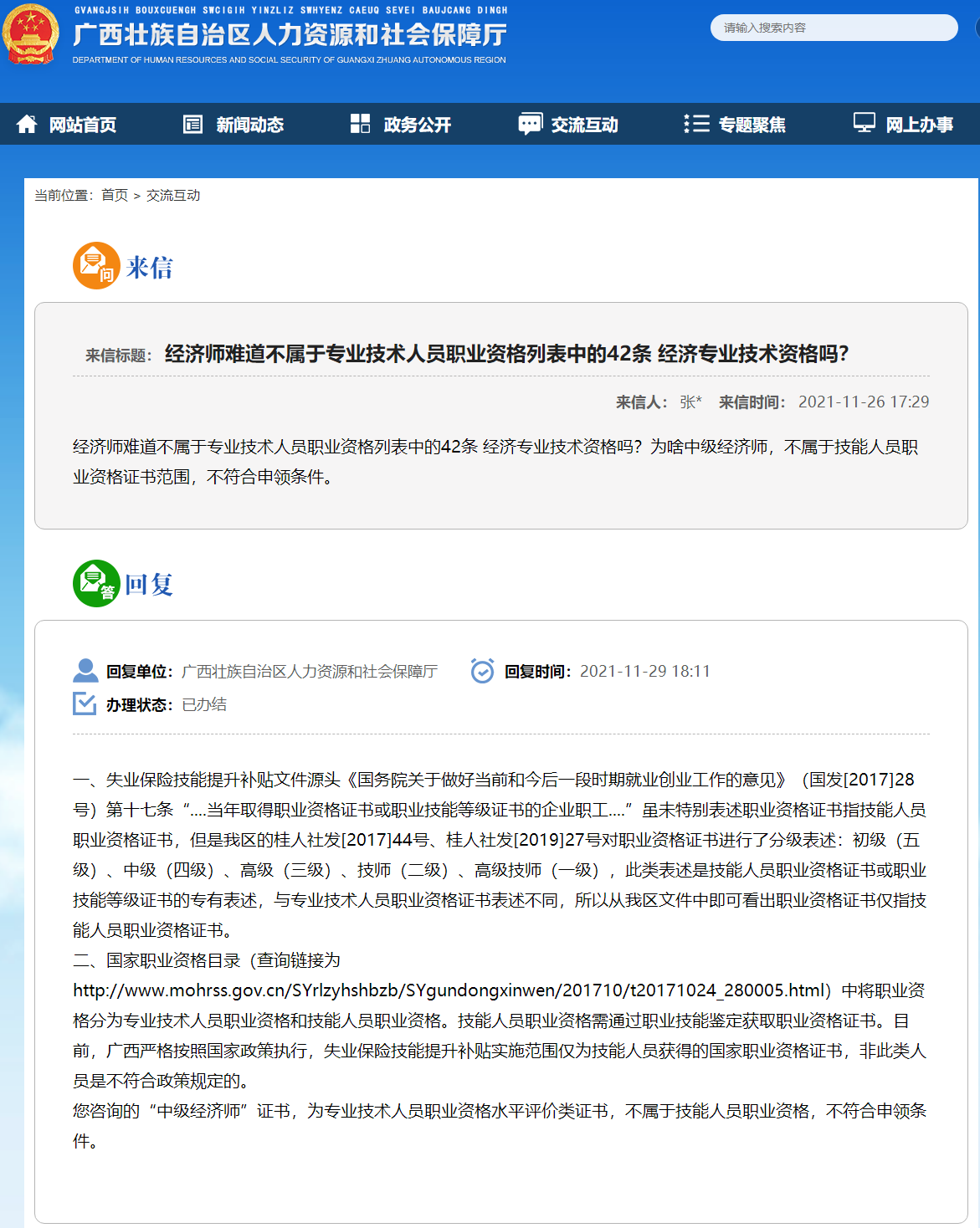 广西考生咨询:经济师难道不属于专业技术人员职业资格列表中的42条 经济专业技术资格吗?为啥中级经济师,不属于技能人员职业资格证书范围,不符合申领条件。