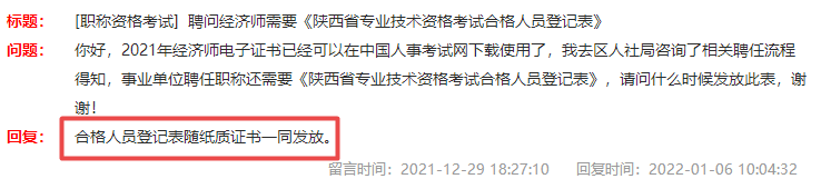 西安考生咨询:你好,2021年经济师电子证书已经可以在中国人事考试网下载使用了,我去区人社局咨询了相关聘任流程得知,事业单位聘任职称还需要《陕西省专业技术资格考试合格人员登记表》,请问什么时候发放此表,谢谢!