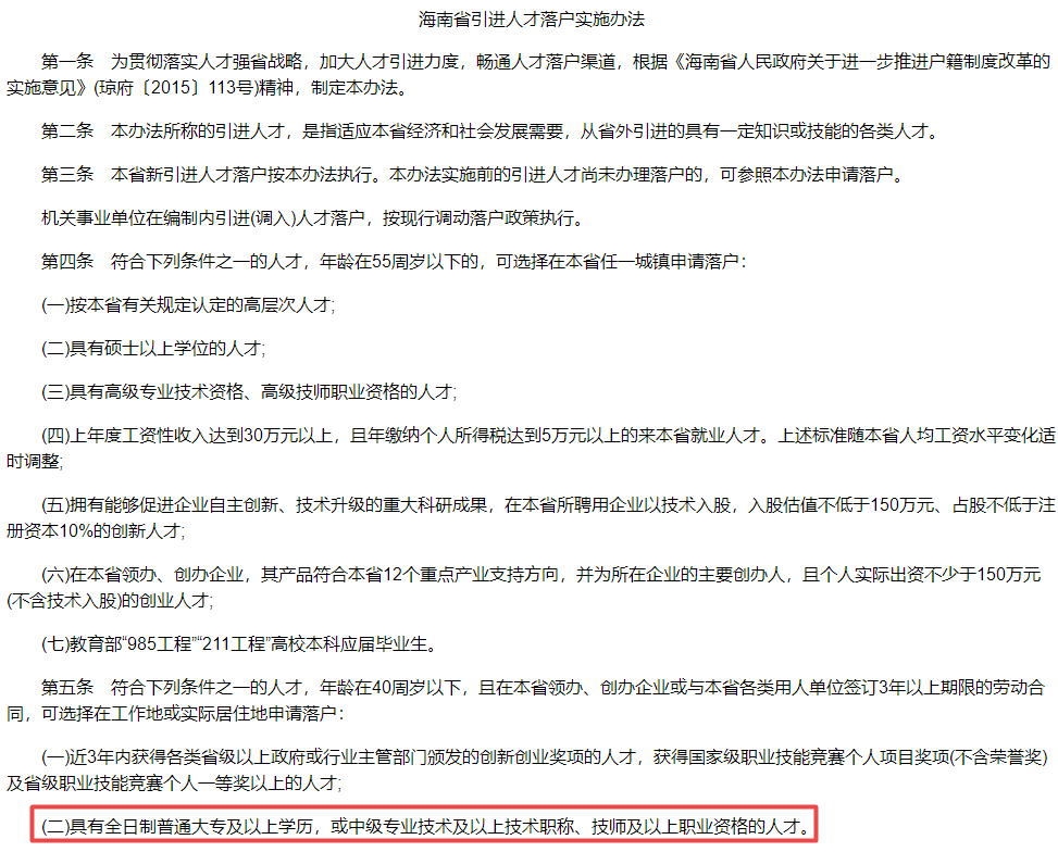 根据《海南省人民政府关于印发海南省引进人才落户实施办法的通知 琼府〔2017〕66号》可知,“具有全日制普通大专及以上学历,或中级专业技术及以上技术职称、技师及以上职业资格的人才。”是可以在海南省落户的。